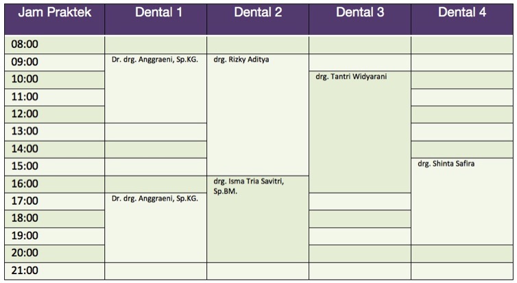 Berikut jadwal pratek dokter gigi specialist dan gigi umum di Klinik Palapa Dentists. Untuk Pendaftaran harap hubungi kami di nomor telepon 021-7806291, 29048890, 29048891